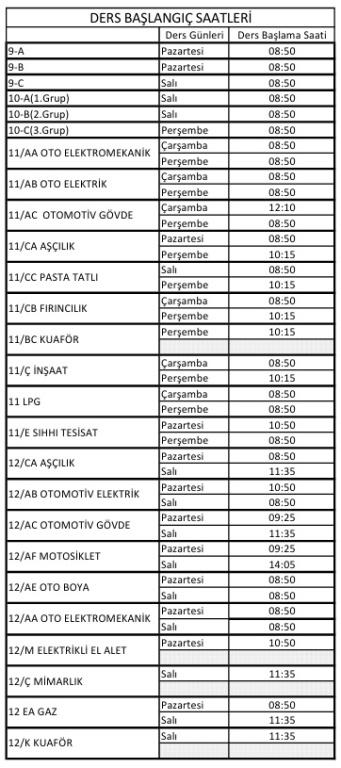 13 Ekim Tarihinde uygulanacak programa göre sınıfların ders başlama saatleri